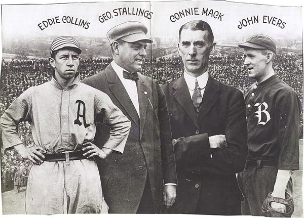 This composite photograph includes the images of Philadelphia Athletics second baseman Eddie Collins, Boston Braves manager George Stallings, Athletics manager Connie Mack and Braves second baseman John Evers. After the Braves swept the Athletics in four in the 1914 World Series, Mack began dismantling the team and Collins was traded. Photo measures approx. 13 5/8 x 9 1/2" and has been folded in half. Otherwise, VG.