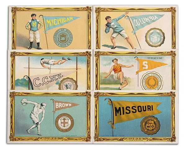 A set of college sports images by the Murad Cigarette Co. from 1910. All good quality images on cardboard from Michigan, Columbia, Syracuse, Brown, C.C.N.Y., and two from Missouri State. The Michigan football image is extremely high grade. On the reverse, each card has listed the full numbered set, along with instructions on how to receive them and an expiration date of June 30th, 1911.