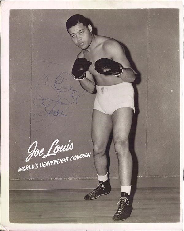 Holding the "World Heavyweight" title for a staggering 12 years, Joe Louis was one of the toughest, hardest hitting boxers in the sport. This item, a signed 8 x 10" of the athlete known as “The Brown Bomber,” is a full body shot of Louis in full fight gear, ducking his head slightly to his right, and ready to take on all challengers. The autograph reads simply, “To Earl, Joe Louis” in blue pen, while the black and white photograph has “Joe Louis World’s Heavyweight Champion” in white lettering to the left. LOA included.