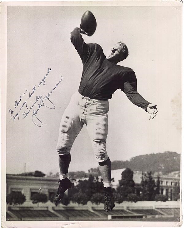Jackie Jensen was an All-American in both baseball and football at the University of California, and became the first person to play in both the Rose Bowl and the World Series when he appeared as a pinch runner for the New York Yankees in the third game of the 1950 World Series against the Philadelphia Phillies. This 8 x 10" photo is inscribed “To Earl -- My very best regards Sincerely Jack Jensen.” Photo shows some wear; small tear in bottom edge and pencil writing on the back. Signature is JSA authenticated.