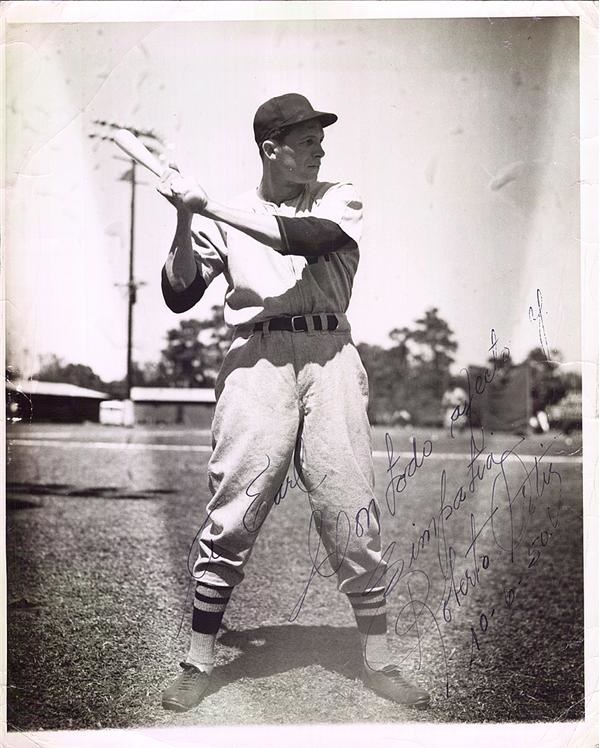 Cuban ballplayer Roberto Ortiz played outfield for six seasons in the big leagues, primarily with the Washington Senators. This 8 x 10" photograph is inscribed in Spanish in black ballpoint, and signed "Roberto Ortiz 10 - 6 - 50.” Ortiz died in 1971 and photos of him are tough to find. VG condition, except for a small tear in the right border; signature JSA authenticated.