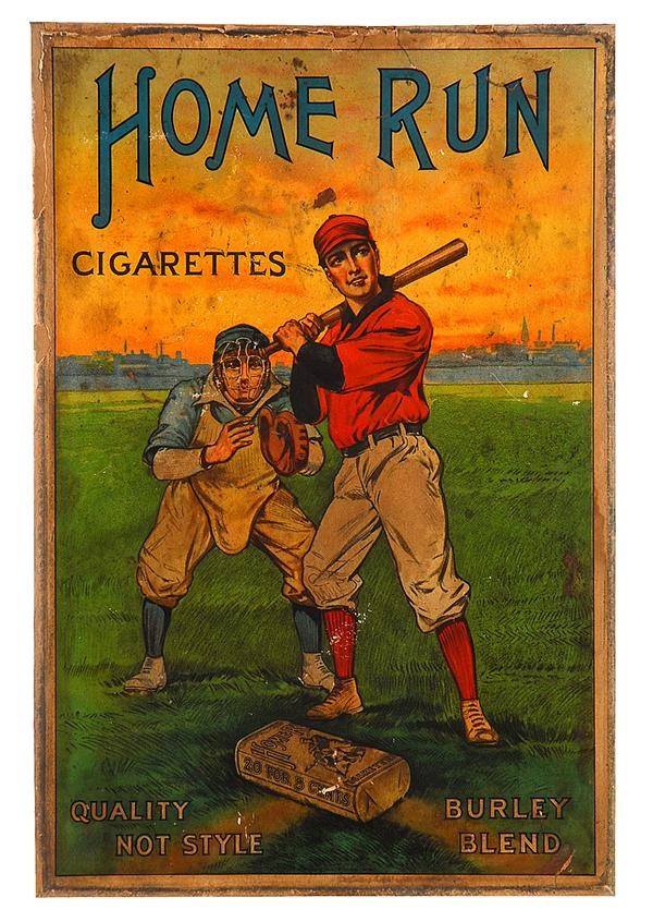 Baseball and tobacco were inseparable in the early days of the sport. The sport has come a long way since then, but if anything positive came from this association, it would be the wonderful vintage art and advertising that was produced at the time. This paper lithograph (on board), advertising Home Run brand cigarettes, features a batter and catcher at what passes for "home plate" -- a box of five cent Home Run smokes. At the bottom, the phrases "Quality Not Style" and "Burley Blend" promote the product. This is one of only two real copies that our experts at Lelands have ever come across. A truly rare find, for both sports fans and vintage collectors.
