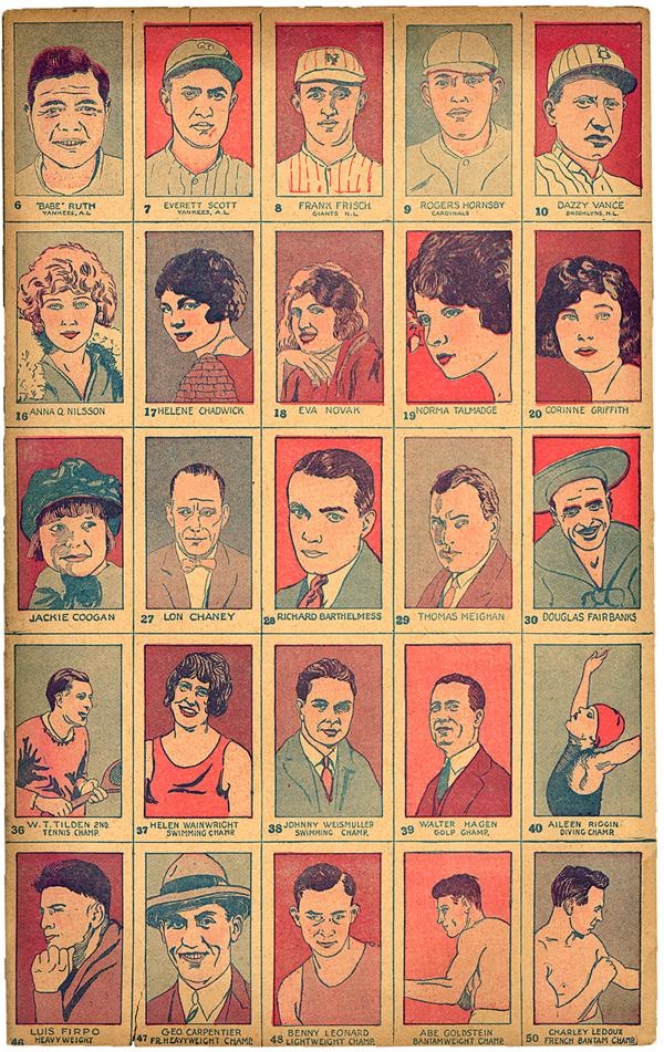 This uncut 1926 W512 card sheet measures approx. 7 x 11 1/4" and contains 25 cards, including Babe Ruth, Frankie Frisch, Rogers Hornsby and other notables of the day from baseball, the movies, boxing, swimming, tennis and golf. Some staining at upper and left edges; several cracks in top edge; small tear in bottom on card 47. Otherwise, VG.