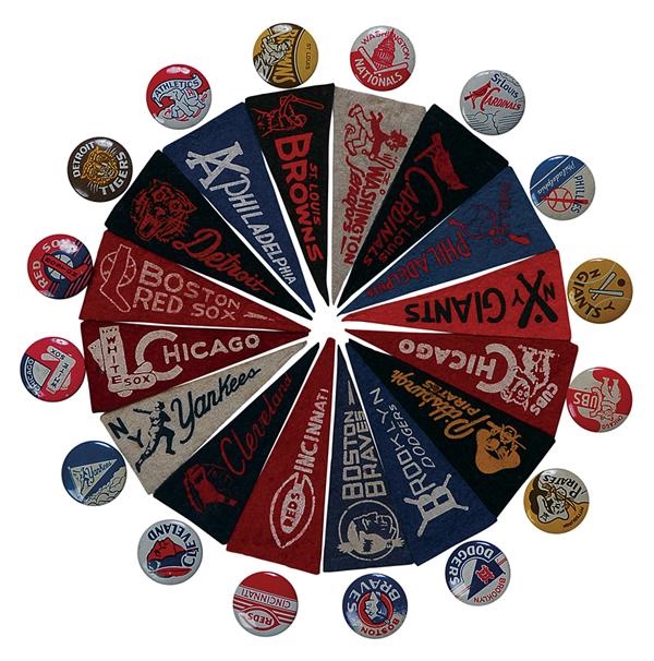 This lot features a complete collection of American Nut & Chocolate baseball pins and corresponding miniature pennants from the 1940s. Containing 32 separate pieces in all, the set is mounted and framed to roughly 12 x 16". Teams represented include the Philadelphia Phillies, NY Giants, Boston Braves, Cleveland Indians, Cincinnati Reds, Chicago Cubs, Pittsburgh Pirates, Brooklyn Dodgers, NY Yankees, Chicago White Sox, Boston Red Sox, Detroit Tigers, Philadelphia A's, St. Louis Browns, Washington Senators/Nationals and the St. Louis Cardinals.