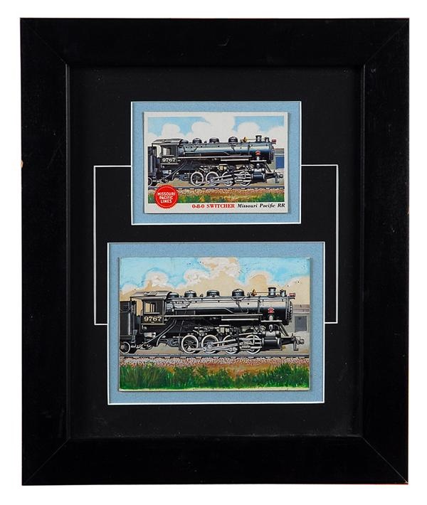 This piece of artwork, used in the 0-8-0 Switcher Missouri Pacific RR card, is an attractive 3.5x5" full-color painting of the impressive black locomotive chugging down the rails, used in Topps' 1955 "Rails and Sails" series. The artwork also comes with the card which bore its image. Both the card and the artwork are in excellent (EX) quality, and the pair is framed out to 10x12".