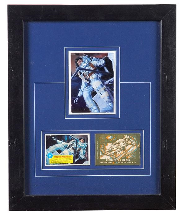 In the '60s, space travel was on the mind of every American, culminating in the moon landing of '69. This piece, from a series of astronaut cards produced by Topps in 1963, was an expression of this space-race obsession. The centerpiece of this framed set is the original flexicrome artwork used during the production of card number 24, "Grissom in Pressure Suit." Underneath, the final card 24 and another card from the set are mounted for comparison. The set, framed out to 13x16", is in excellent (EX) condition, and is a wonderful display piece for vintage Topps fans everywhere.