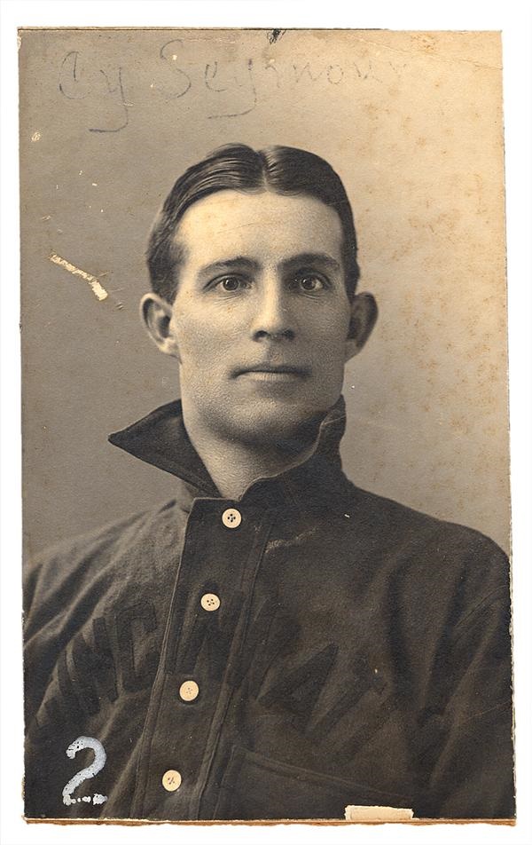 This photograph of major league pitcher/outfielder Cy Seymour was taken by Carl Horner during the first decade of the 20th century. Seymour is pictured in a Cincinnati Reds uniform (he played for the Reds from 1902-1906) and his name is written at the top in very faint ink. The number 2 is printed in white in the lower left corner. Photo measures 3 1/4 x 5 1/4" and is mounted on board. Slight surface wear; otherwise VG.