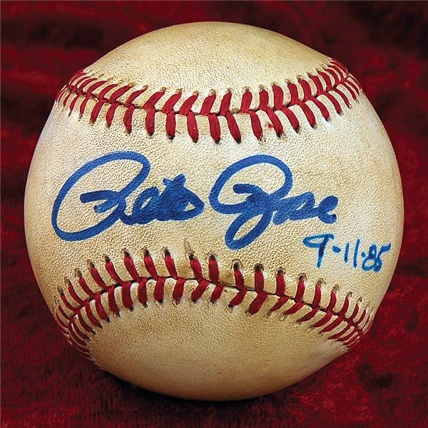 Pete Rose's hit record dwarfs that of any other player in MLB history. This Official National League (Feeney) baseball is from one of the most important baseball games of the 20th Century. This baseball is one of a number of balls that were used during the game that set Pete Rose's record, broke Ty Cobb's previous record, and helped usher in a new record that will likely never be broken. The ball, obtained by umpire Bob Engel, shows fantastic use, and was signed on its sweet spot by Pete and dated 9-11-85. The signature, in blue sharpie, grades an 8/10. This item comes with an LOA, with a handwritten note by Engel on back discussing the ball.