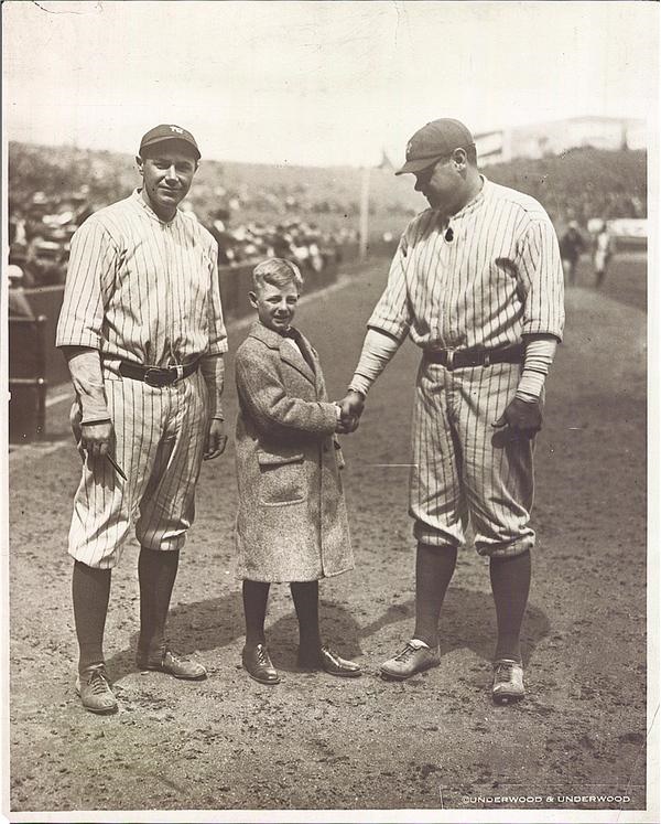 The Sultan of Swat shakes hands with young boy while teammate Mike McNally looks on. Wonderful Yankee Stadium photo by Underwood & Underwood. About 8x10”. Perfect contrast. Tiny corner chip and repaired corner o/w beautiful. Dated May 31, 1924.