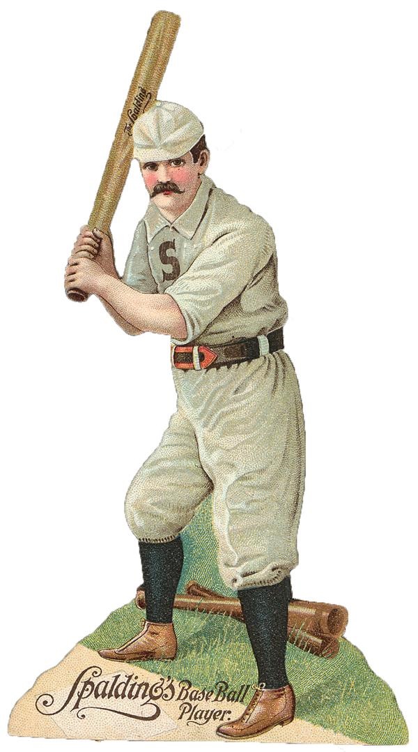 Fabulous diecut features the tale of baseball on the verso by Henry Chadwick as well as the original paper wedge to prop this up. NRMT-MT condition, this is one of the finest ones we have seen. The bat is not damaged as it usually is.