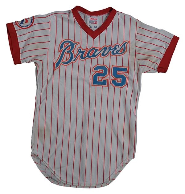Superb specimen with tons of use. Great patch on the sleeve of this Wilson 42 tagged “76 42” in collar. Scarce pinstriped pullover with “Braves” faded to baby and pink.