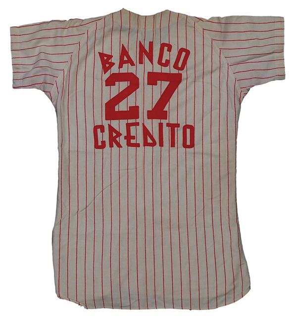 Stunning home flannel worn in his championship play with Caguas. Fascinating Puerto Rican League jersey with “Banco Credito” advertising on the verso of his familiar #27. Size 44 tagged by All Stars of Santurce