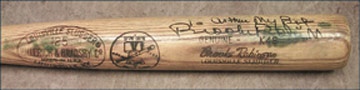 So many things that make this a great bat-hard to decide where to begin. First, the Hillerich & Bradsby K48 has that "Liberty Bell" bicentennial stamping that we all love. Second, it shows fine use, with some pretty blue ball marks still easily visible. And third, there's a giant NRMT black marker inscription, "To Arthur, My Best, Brooks Robinson" on the barrel. Number "5" in marker on knob.