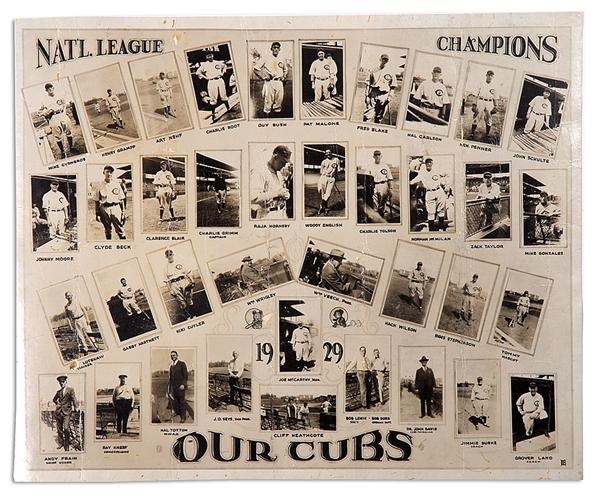 Out of this world image of the National League Champions is one we have never seen before. This mighty lineup is led by Rogers Hornsby, Charlie Root, Charlie Grimm, Gabby Hartnett, Kiki Cuyler, William Wrigley, William Veeck, Hack Wilson, and Joe McCarthy. Rebacked with some creasing. The only specimen known to exist.
