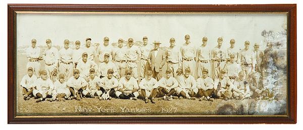 Important 23x9” panorama was presented only to players (and a few VIP’s) from the greatest team ever. This specimen was presented to catcher Benny Bengough. Most aptly, Babe Ruth and Lou Gehrig are standing side by side. Water damage to right side affects no player’s o/w EX-MT. 23x9”.