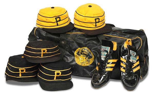 All of this was used by Willie Montanez during his 1981-82 tenure with the Pirates. Includes: large vinyl equipment bag with Pirates logos and “14” in black marker, two pillbox style caps in gold with black striping (both with “14” in brim in black marker), two pillbox style caps in black with gold striping (both with “14” in brim in black marker), pillbox style spring training cap in black with gold striping, and one pair of black and gold Adidas spikes in black and gold (“14” in black marker on tongues).