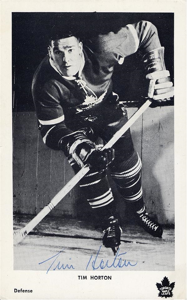 Playing in 24 NHL seasons for the Toronto Maple Leafs, New York Rangers, Pittsburgh Penguins, and Buffalo Sabres, Tim Horton was an example of a true hockey sportsman. This slightly worn black and white postcard, a perfect full-body action shot of Horton in Maple Leafs gear, has an all-too-rare autograph from the player himself. Includes LOA.