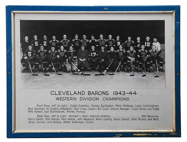 Once hung in the home of the defunct AHL team, the Cleveland Barons, this black-and-white photo is of the full 1943-44 championsip-winning roster. In EX condition and still in its original frame, the picture measures roughly 26x35" althogether, and looks great. Written at the bottom of the image in black lettering, "CLEVELAND BARONS 1943-44 WESTERN DIVISION CHAMPIONS" and lists the members of the team from left to right in the space below.