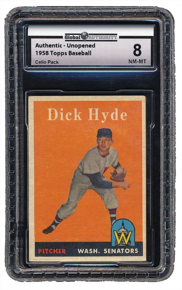 This unopened pack of Topps baseball cards from 1958 shows pitcher Dick Hyde of the Washington Senators on the top and Card #109 Herb Plews, also of the Senators, on the bottom. 1958 Topps cards are notorious for having corner and edge wear, so an unopened pack of twelve (12) never-touched cards has added appeal to the collector.