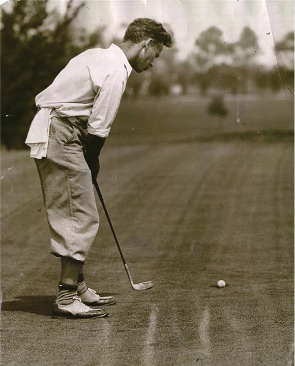Fabulous image of Jones when he lost the 36-hole playoff to Robert Farrell at Olympia Fields. Original paper caption on verso. Small tear o/w EX. 7 x 9”.
