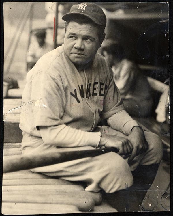 Babe Ruth sits on visitor’s dugout with his trusty bat “Merle.” 1” tear and a few pinholes o/w EX. 7 x 9”.