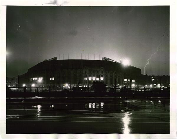 Fabulous image of the stadium for the rained out Louis-Walcott fight. 7 x 9”. EX-MT. Check out the lightning.