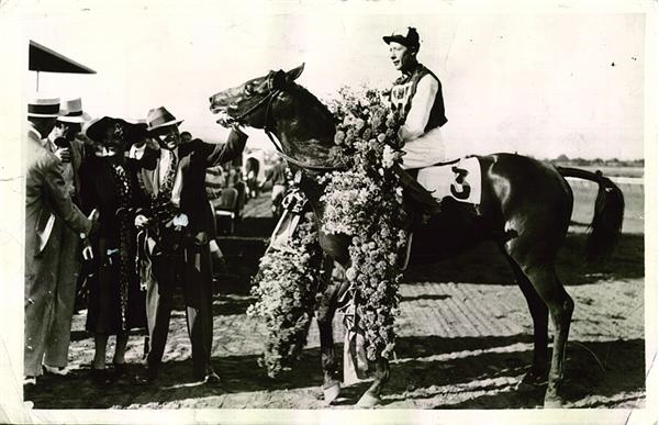 1937 win at Suffolk Downs. 7 x 11”. Minor creasing and a tear.