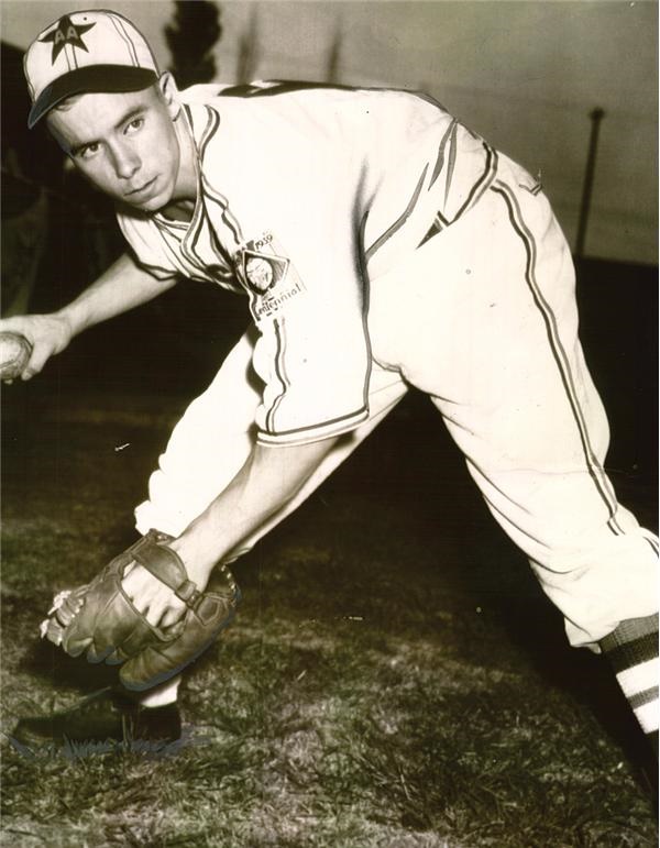 Marvelous image of Pee Wee on the American Association All-Star team. 1940 stamp on the verso along with original newspaper article that he has just been signed by the Dodgers. 7 x 9”. EX-MT.
