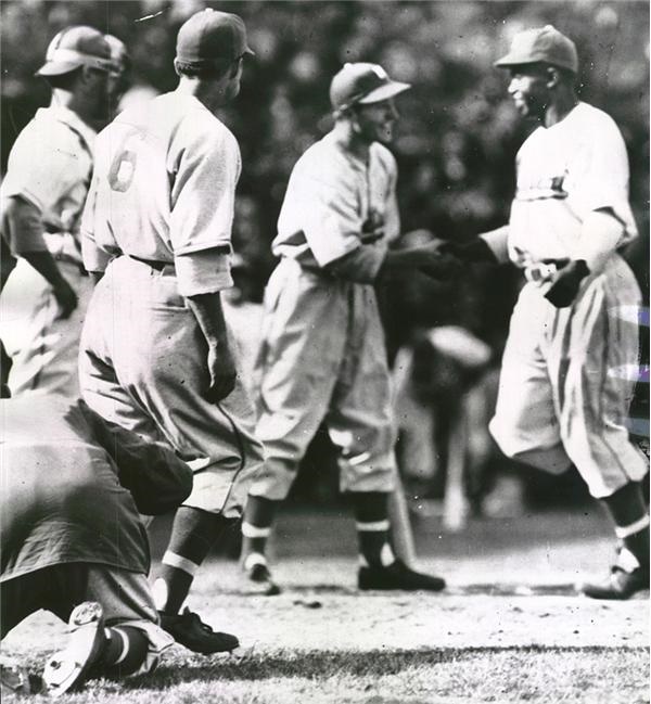 April 18, 1946 game when Jackie Robinson debuted for the Montreal Royals and truly broke the color line. Here he is hitting his first home run. 6.5 x 7”. EX-MT.