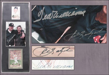 Attention Bostonians! You should never show your face at Fenway again unless you place a bid on this great display featuring two signatures apiece from the greatest batters to wear the "B." Glossy color 8x10" photo at center is signed by each in perfect silver sharpie, hemmed in between a pair of Perez-Steele cards individually signed in flawless blue sharpie.