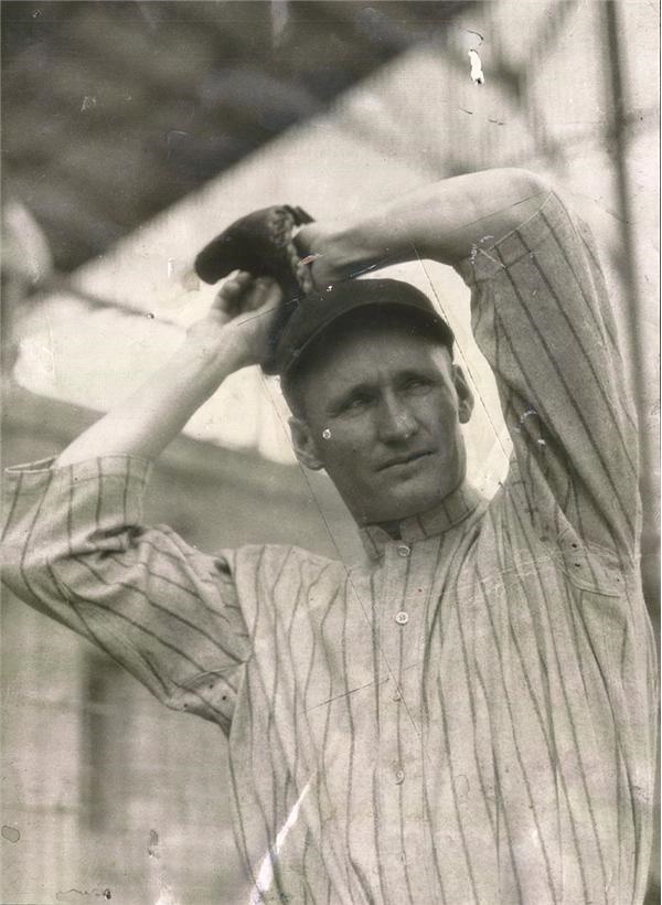 Beautiful pitching pose with the Senators in Johnson's 17th season. GD-VG. 6 x 8”.