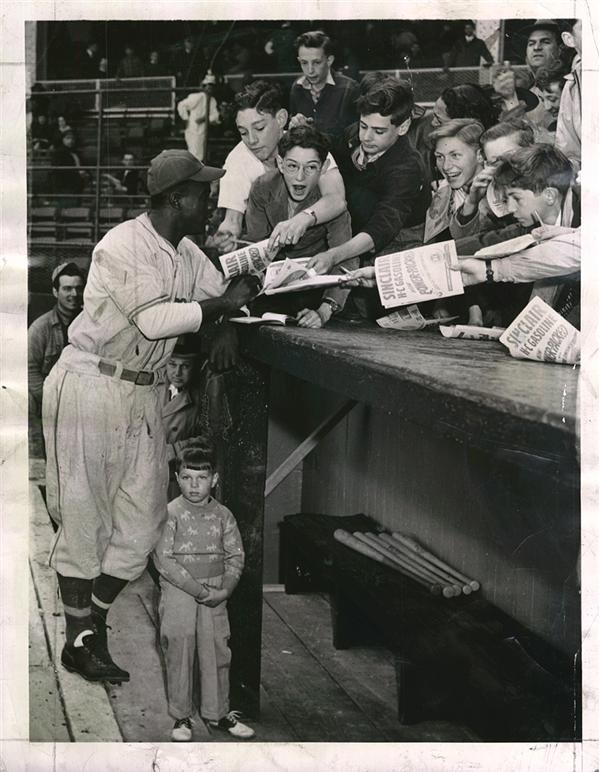 Jackie at Ebbets Field for his first game ever. He is playing his first exhibition game against Jersey City. Tiny tear o/w EX. 7 x 9”.