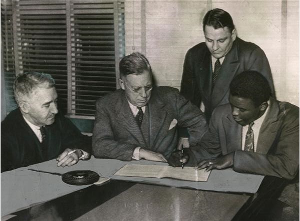 Jackie Robinson signs his 1946 contract with the Montreal Royals. Branch Rickety, Sr. is not there but his son Branch Rickey, Jr. is. EX. 7 x 9”.