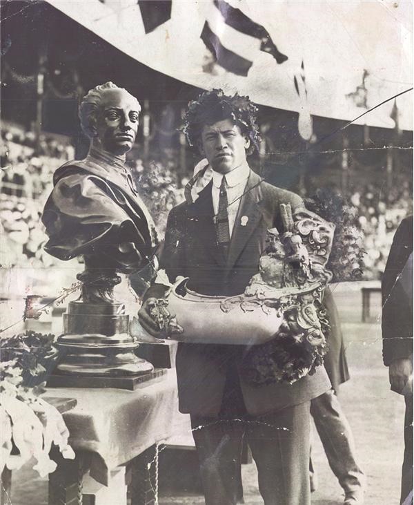 Stunning image of him receiving the trophies of Stockholm in the 1912 Olympics. Printed in the 1930's. Significantly repaired tears but still looks attractive. 7 x 9”.