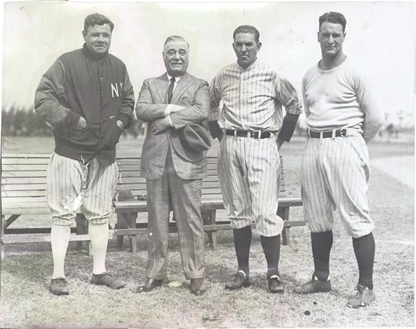 Babe Ruth and Lou Gehrig are joined by owner Jacob Ruppert and manager Bob Shawkey. 7 x 8.5”. EX+.