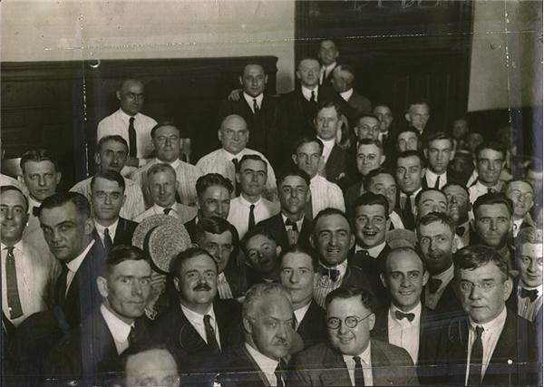 Amazing photograph that has never before been seen. This unpublished image shows the Black Sox joined by the jurors that set them free following the trial. Indicative of the entire episode (they were set free when the confessions were “lost”) the jurors seem more like fans than valances of justice. Shown in this smiling crowd are the players including: Shoeless Joe Jackson, Buck Weaver, and Swede Risberg. There is minor damage where publishing marks have been removed to the borders and where the players and some jurors and court officers were numbered. 11 x 8”. Small tear o/w EX.
