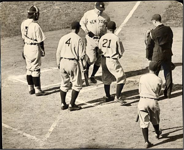 From the game when Babe Ruth hit his famed-called shot. This is the one he hit in the first inning. Lou Gehrig scores ahead of him and congratulates him. Tiny tear o/w EX+. 8 x 10”.