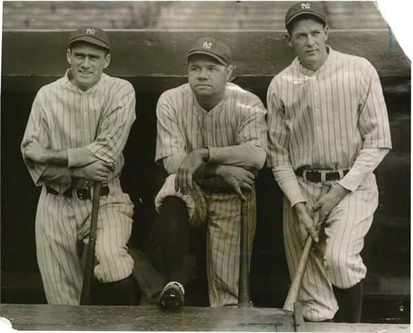 Babe Ruth, Bob Meusel and Earl Combs, the legendary Murderer’s Row. Two corner clips and tiny tear o/w EX+. 6 x 7”.