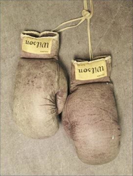 Wilson Golden Gloves worn by one of the greatest pound for pound fighters of all time. These originally came from Elizabeth Lambright, whose brother Middleton was a physician for the City of Cleveland Ohio Boxing Commission. He was a personal friend of Sugar Ray's and he gave them this pair of gloves. They come with her LOA. Nice use and perfect provenance. We do not know if they were used in training or in a fight.