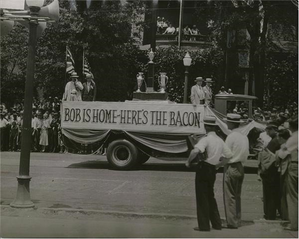 Wonderful parade float bannered, “Bob Is Home, Here’s The Bacon.” It is filled with his trophies and awards. This was the "biggest parade in the city’s history." 7 x 9”. EX+.