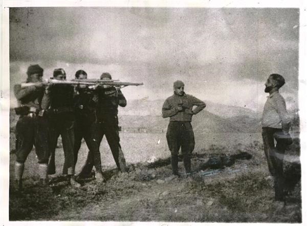 Execution firing squad is in full view as this fascist rebel refuses a blindfold. 7 x 9”. EX+.
