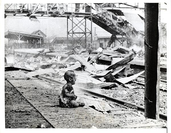 Classic image a baby in the ruins, an innocent victim of the carnage and destruction. The signature image of this ghastly conflict. Printed 1959 with original paper caption on verso of this UPI photograph. 7x9”. NRMT.