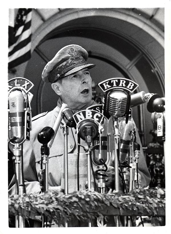 Four marvelous images of this old soldier. Includes his no political ambitions speech (1951), two landing on Leyte Point (1944), and shaking hands with an Acme photographer (1951). EX-MT. 7x9” and one smaller.
