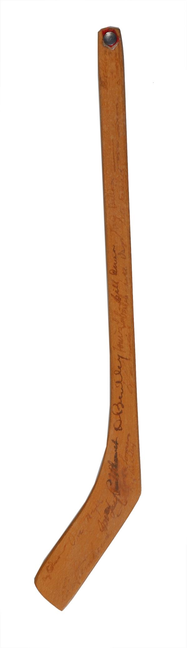 This miniature stick, signed in the 1940's by over a dozen pro hockey players, including Hall of Famers Doug Bentley and Bill Durnan, is an EX condition artifact from the mid-20th century NHL. Some of the signatures appear very light, but the Bentley and Durnan autographs rate a solid 7/10. A tack has been stuck through the top of the shaft, but the stick has held up very well and shows no sign of cracking, with very few chips in the wood.
