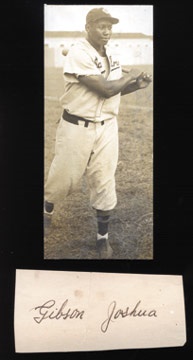 Wonderful photo of Josh as a member of the great Cuban baseball team Santa Clara. This is actually a wire photograph (Cuban) with the photographer's stamp on the verso and a partial paper caption in Spanish. It even has a small impressed cartouche as well at the bottom. A fabulous image circa 1948 with crystal clear clarity and NRMT condition. Comes with vintage "signature" that reads "Gibson Joshua". We do not believe he signed it but it is vintage and was with the photograph for display purposes. 5.5x2.5".