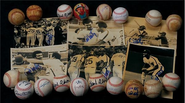 Game Used Baseballs are all vintage notated with wear: 1) Notated “First Major League Grand Slam Aug 16 1974 Phillies 8 Cubs 3” with names of teammates including bold Mike Schmidt. 2) Recently signed “100 RBI Willie Montanez” in blue sharpie. From 1975 season. 3) 11/6/79 600 hits in the Puerto Rican League. 4) “My 1500 Hit in the Major Leagues off of (Bob) Knepper” 6/24/80. Browned. 5) Bobby Brown game used ball. Signed Baseballs are overall EX and on various balls. 1-3) Three Hank Aaron signed baseballs in black marker huge sigs. 4) “Best Wishes to Guillermo Hank Aaron” (Feeney bb). 5) 1980 Montreal Expos Painted Baseball in the style of George Sosnak. 6-12) Various single and multi signed baseballs including two Robby Alomar’s and a Cepeda-McCovey. Signed Photos: 1-9) Vintage photos, recently signed in blue sharpie by Willie includes WM Day in Philly. Plus mounted photo signed by Hank Aaron (vintage) and Willie recently.