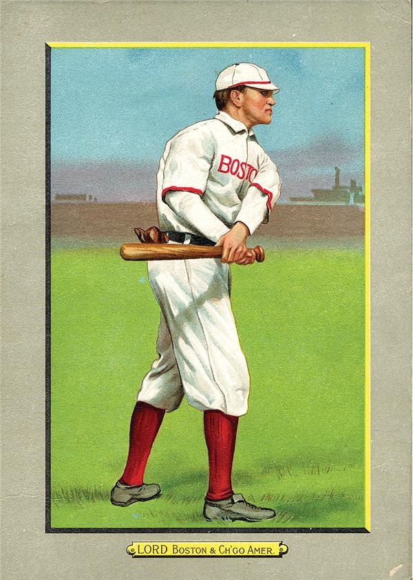 1911 T3 Turkey Red baseball card shows Harry Lord in a Boston Red Sox uniform. An ad for Turkey Red cigarettes appears on the back. Card measures 5 3/4 x 8". Light creases, grades VG.