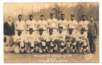 Exceptional postcard is one of the finest extant. Staggering team makes a bid for the greatest ever. At bottom center reads "'Homestead Grays of 1931' 4-3-31 Colored Champions" in white. Boasts a lineup of Josh Gibson, Oscar Charleston, Willie Wells, Willie Foster, Vic Harris, Double-Duty Radcliffe, Ted Page, Smokey Joe Williams, Ray Brown, and more. Photographer's cartouche at bottom right. Unposted, front is NRMT-MT back has light even soiling, overall EX-MT.