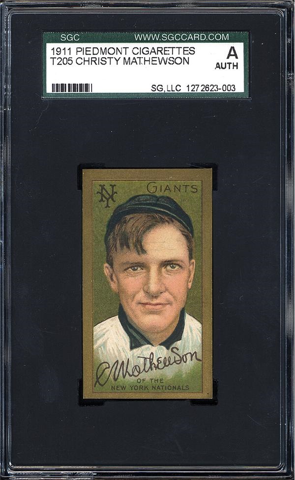 This 1911 T205 gold border Christy Mathewson tobacco card depicts the “Big Six” during his New York Giants days in a season that ended with a National League pennant. The card shows very nicely, featuring beautiful vibrant colors and no discernible wear on the front. It has a Piedmont back with very slight discoloration and a few spots near the bottom. The card has been trimmed, but is authenticated and graded “A” by SGC.
