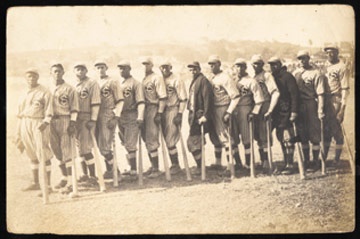 One of the finest Negro League photographs we have seen. Amazing image of Charleston and this historic Cuban team has crystal clear contrast. He is posed with teammates including Alejandro Oms in his rookie year, Bill Holland, Dave Brown, Julio Rojo, Champion Mesa, Oliver Marcelle, Dave Brown, and Bombin Pedroso. Fascinating side story to this team as Marcelle was there the night when Dave Brown killed a man in a barroom fight. Further fuel to this fire was that Brown himself once hit Charleston with a bat. Measures 6.5x4.25" and is EX. Charleston is wearing his Chicago American Giants sweater. Charleston is of course considered possibly the greatest player of any color to ever grace the diamond. The next season and with essentially the same club they became the Negro League team considered the greatest ever.